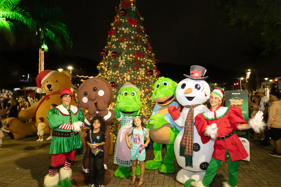 Os personagens do Natal de Joinville: os duendes Chineque e Chimia e o jacaré Fritz (mascote da cidade) retornam para encantar o público, com encontro marcado para fotos e interação com público.